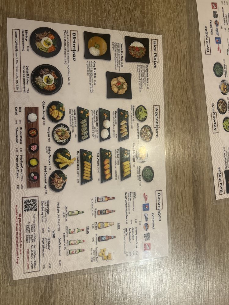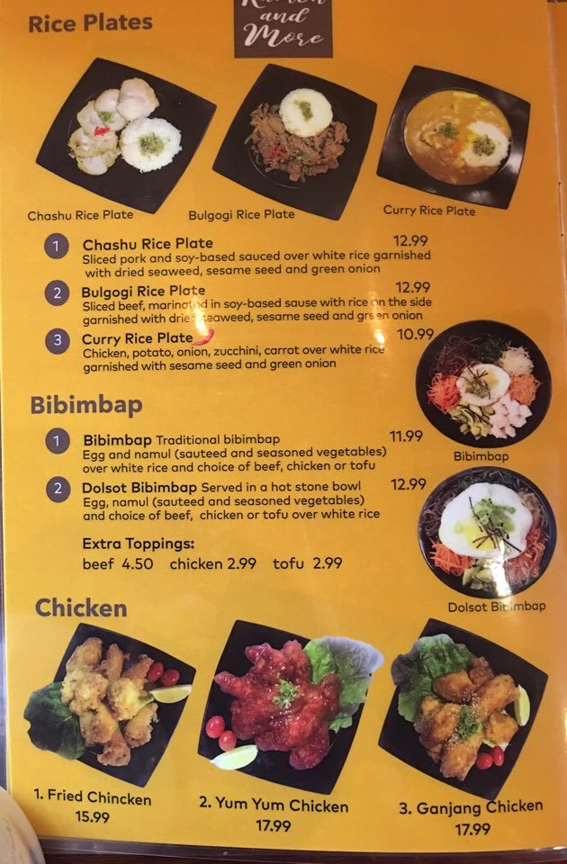 Served in a hot stone bowl. Egg, natural (sauteed and seasoned vegetables) and choice of beef, chicken or tofu over white rice.